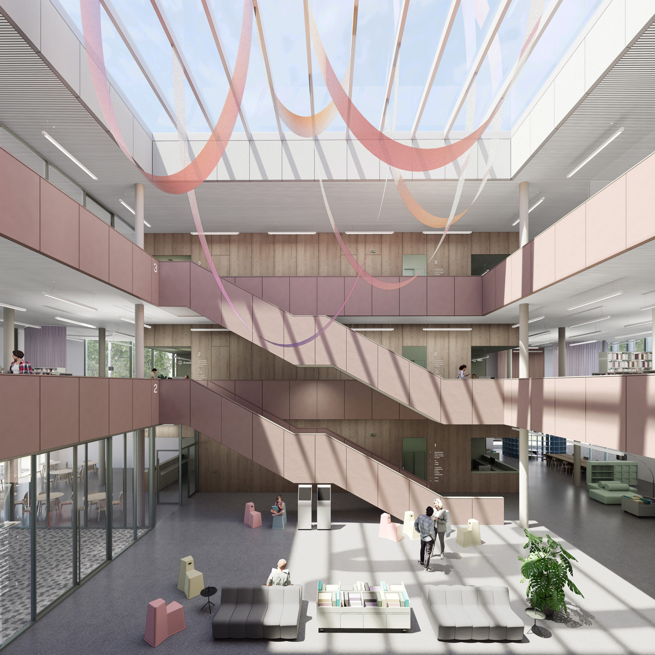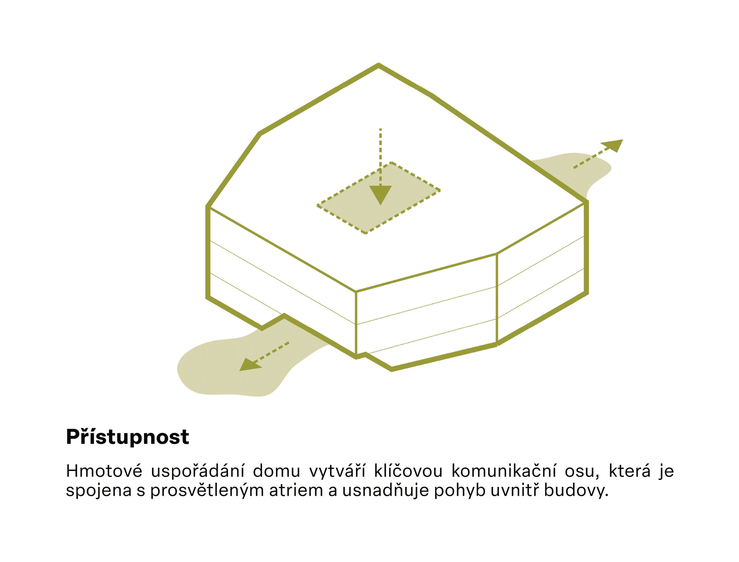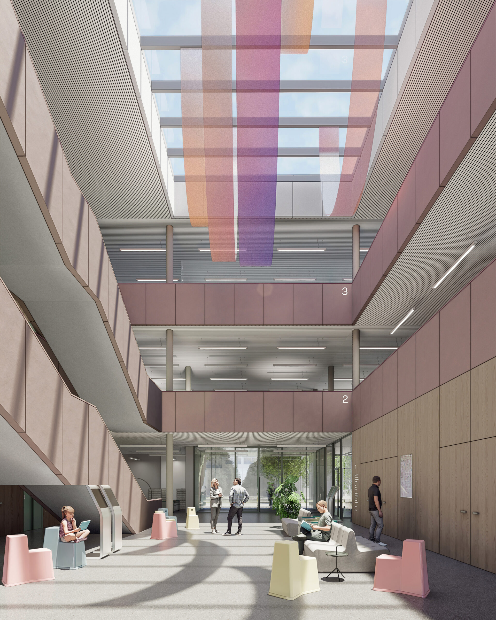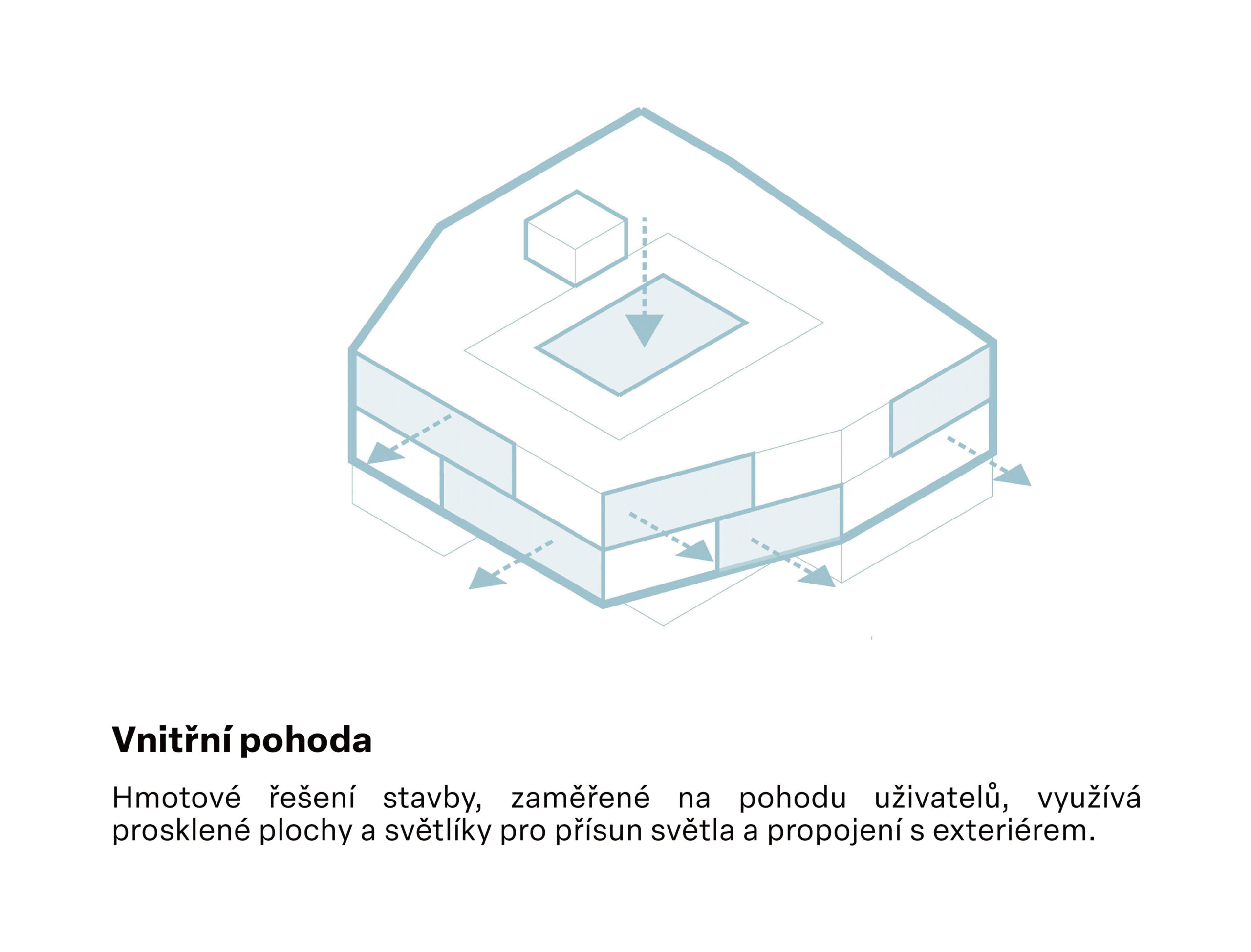 Ústředním architektonickým prvkem je schodiště vedené středem prosvětleného atria. Jedná se o výrazný vertikální motiv, který propojuje patra nejen fyzicky, ale i vizuálně. Materiálová paleta staví na přírodních, dlouhodobě odolných materiálech v kombinaci s jemnými pastelovými odstíny. Celek oživují variabilní textilní prvky a umělecké instalace. Pečlivě navržené denní i umělé osvětlení, akustická pohoda a zdravé mikroklima jsou nedílnou součástí konceptu.