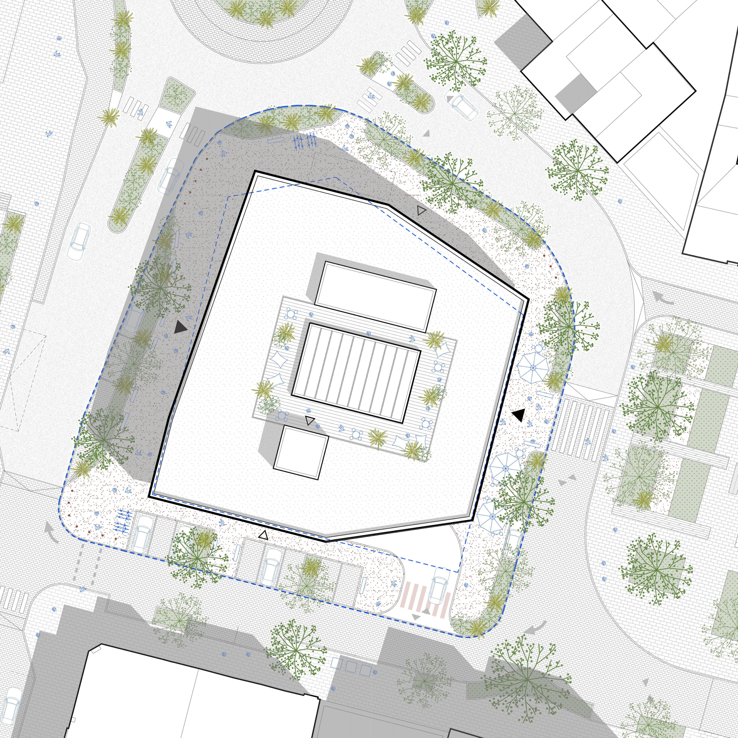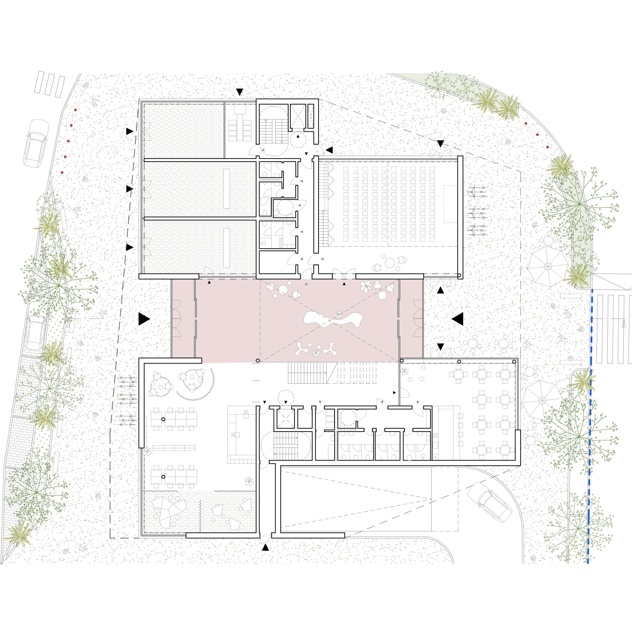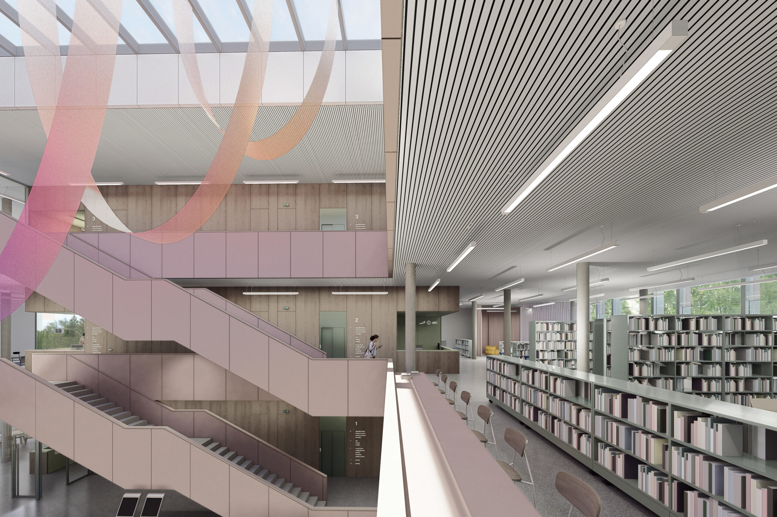 Narozdíl od tradičních knihoven, které mnohdy působí odměřeně, zve budova dovnitř díky kombinaci různorodých funkcí široké spektrum návštěvníků. Přízemí plynule navazuje na rytmus ulice: kavárna, multifunkční sál i drobné obchody vytváří téměř nepostřehnutelný přechod mezi interiérem a exteriérem. Díky transparentní fasádě je také vizuální propojení mezi knihovnou a okolním městem plynulé.