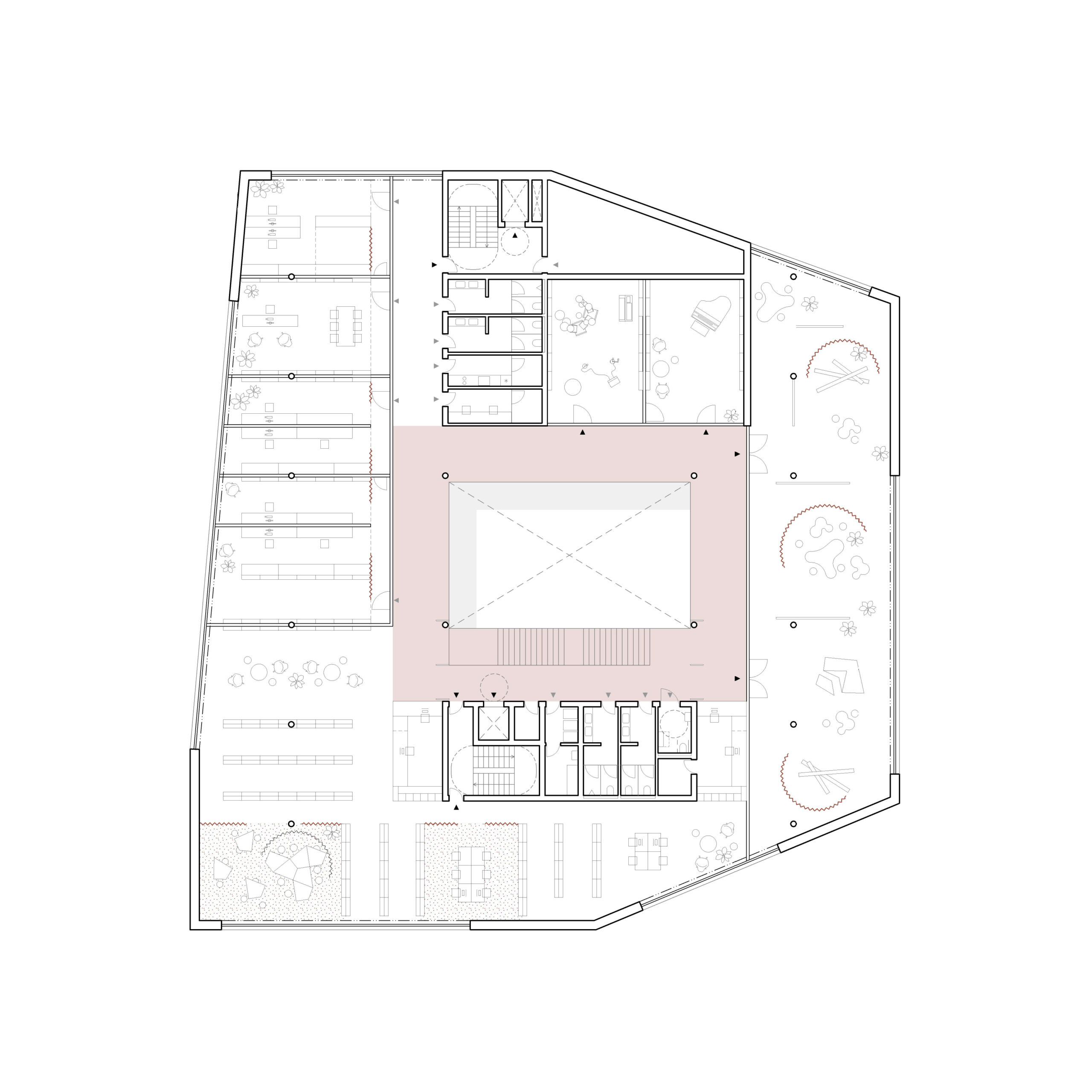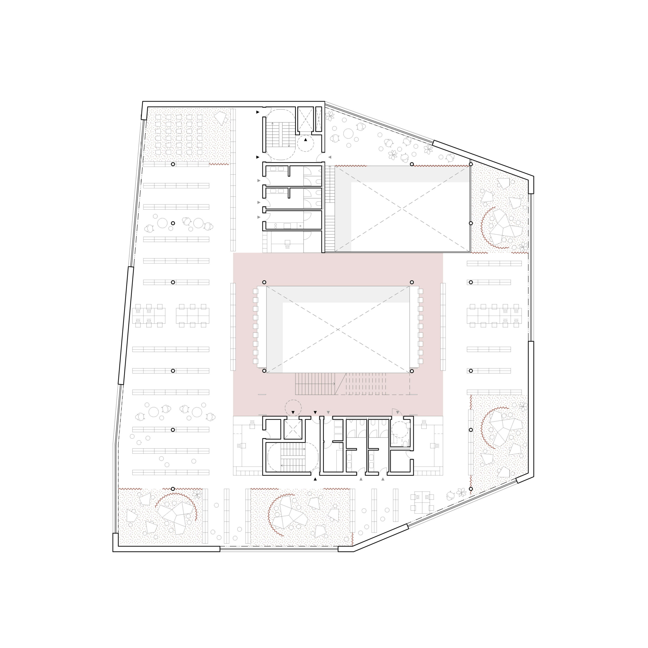 V nejvyšším patře se nachází flexibilní galerijní prostor orientovaný k náměstí, přičemž část ploché střechy slouží jako veřejně přístupná terasa. Všechny tyto funkce aktivují prostor kolem knihovny a přirozeně tak zapojují budovu do každodenního provozu čtvrti.