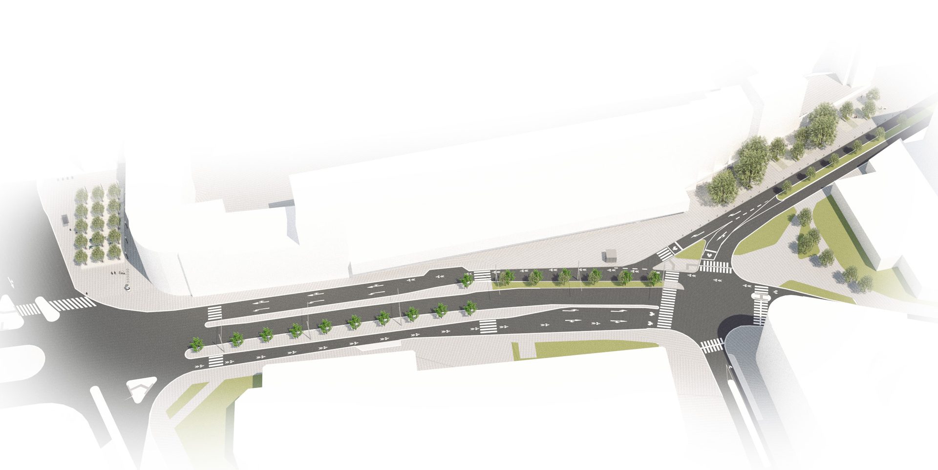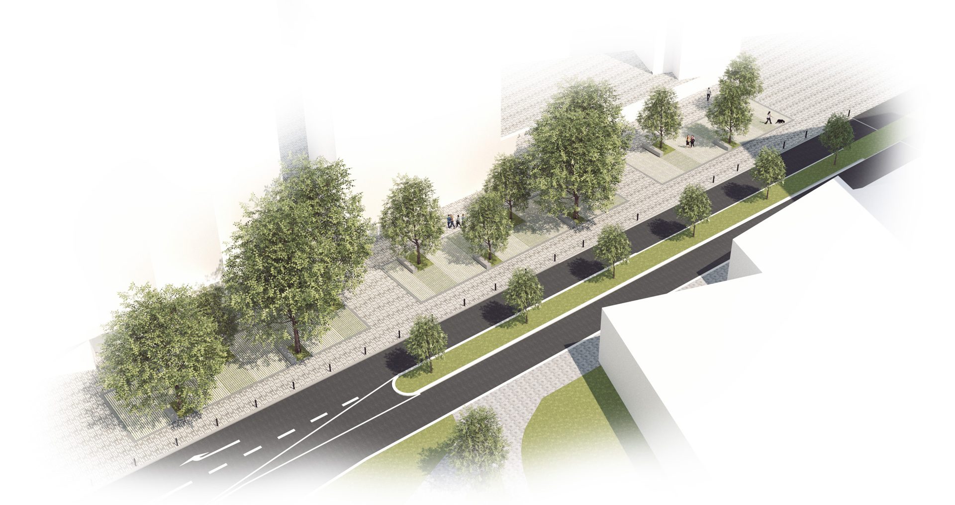 Přestože je ulice Ondříčkova ve své spodní části důležitým propojením Žižkova a Olšanského náměstí, její současná podoba tomu neodpovídá. Zásadním funkčním problémem je absence pěší komunikace podél objektu OC Bezovka, a to v kombinaci s rampou zásobování vytváří neprůchozí a zcela nefunkční veřejný prostor. Návrh proto v první řadě napravuje tento funkční nedostatek a v návaznosti na nové uspořádání jízdních pruhů vzniká v tomto úseku také malý ostrůvek osazený stromy. Při boční fasádě budovy SUPŠ navrhujeme v lokálním rozšíření Ondříčkovy ulice nový klidový veřejný prostor. Poměrně široký pás v šířce stávajícího chodníku je nově koncipován jako kombinace pěší komunikace a parku. Stávající stromy jsou ponechány a doplněny o nové v rámci prostoru vymezeného kombinací několika druhů zatravňovacích dlažeb pro zlepšení vsakovacích podmínek a celkové atmosféry. Tento nový veřejný prostor je doplněný lavičkami a dalším městským mobiliářem a je po obou stranách lemován chodníky z typické pražské žulové mozaiky.