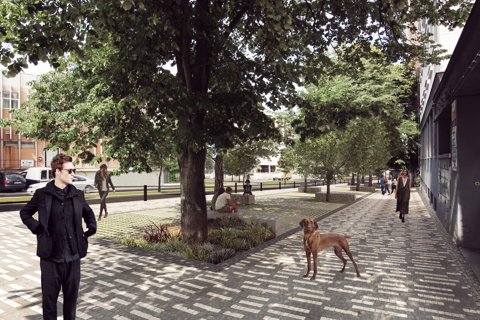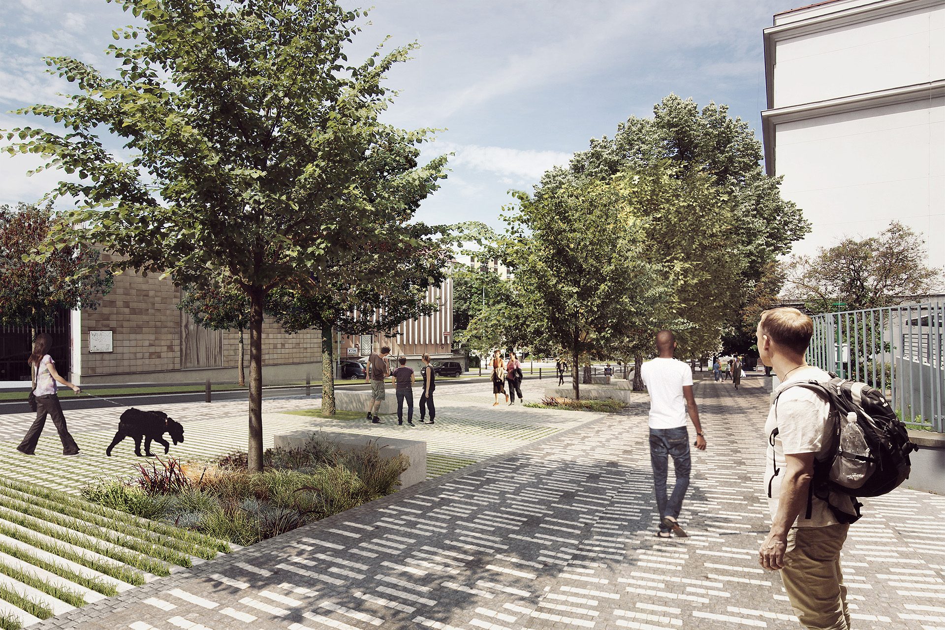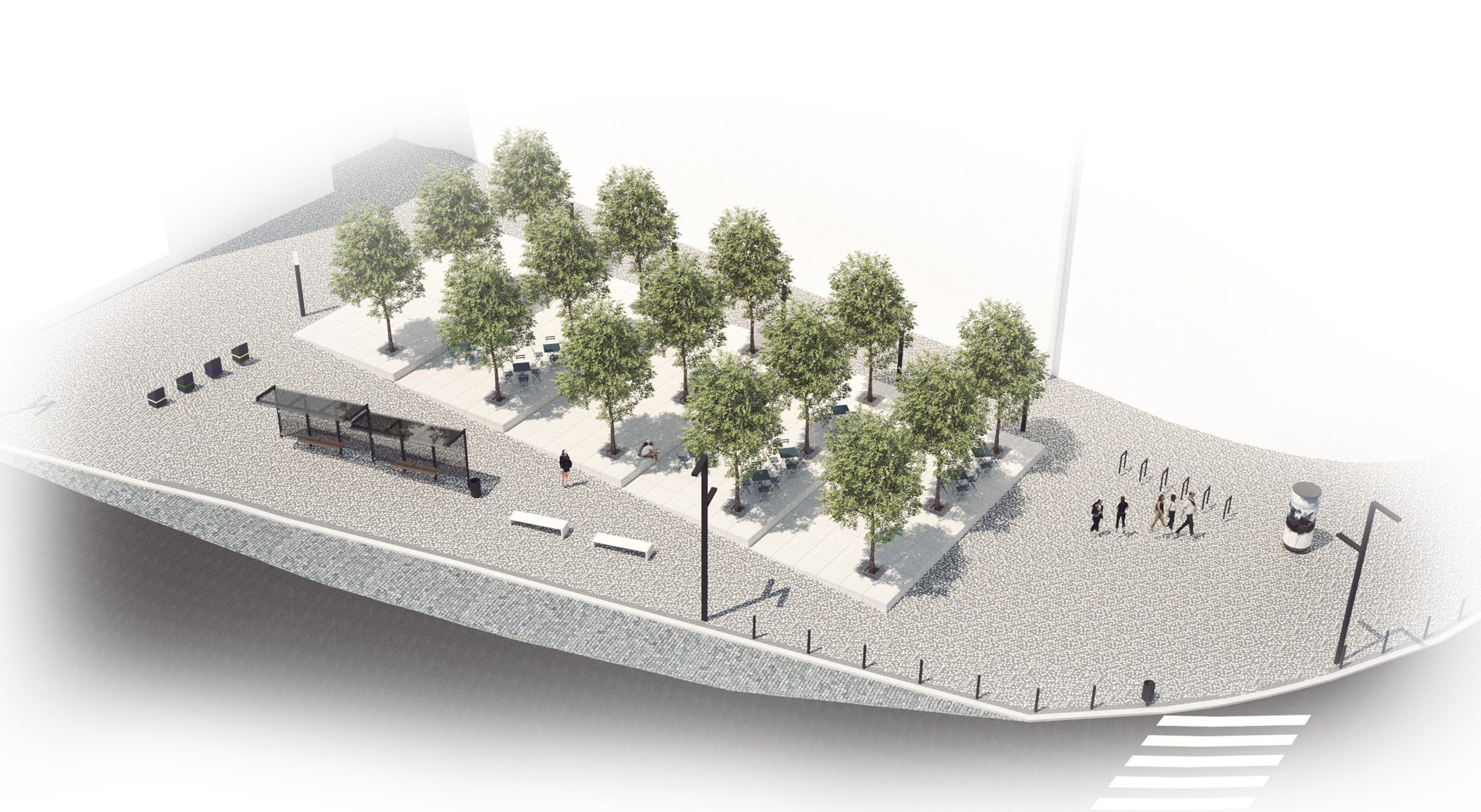 V atypickém ustoupení uličního profilu v místě vyústění ulice Jičínská do složitého prostoru Olšanského náměstí je v současnosti umístěno parkoviště. V rámci plánovaného zklidnění dopravy v místě křižovatky Olšanská, je při Jičínské ulici navržena svažitá piazzetta navazující na obchodní parter přilehlých bytových domů. Svažitý veřejný prostor je částečně vyrovnaný pomocí několik pobytových platform, které umožňují rozšíření sezónních aktivit navazujících kaváren a restaurací. Významným novým prvkem na piazzettě je výsadba stromů, které pomáhají v tvorbě příjemného mikroklimatu ve svém okolí. Materiálové řešení vychází z tradiční pražské žulové mozaiky, masivních žulových kostek v místě dopravního zatížení a betonových prefabrikovaných prvků vymezující prostor navržených platform. Celý prostor piazzetty je kompletně vybavený novým městským mobiliářem. Výrazná koncentrace rezidentů, studentů, sportovců, nakupujících, hotelových hostů a návštěvníků Olšanského hřbitova dává velký potenciál pro rozvoj celé lokality Olšanského náměstí a také jejího bezprostředního okolí.