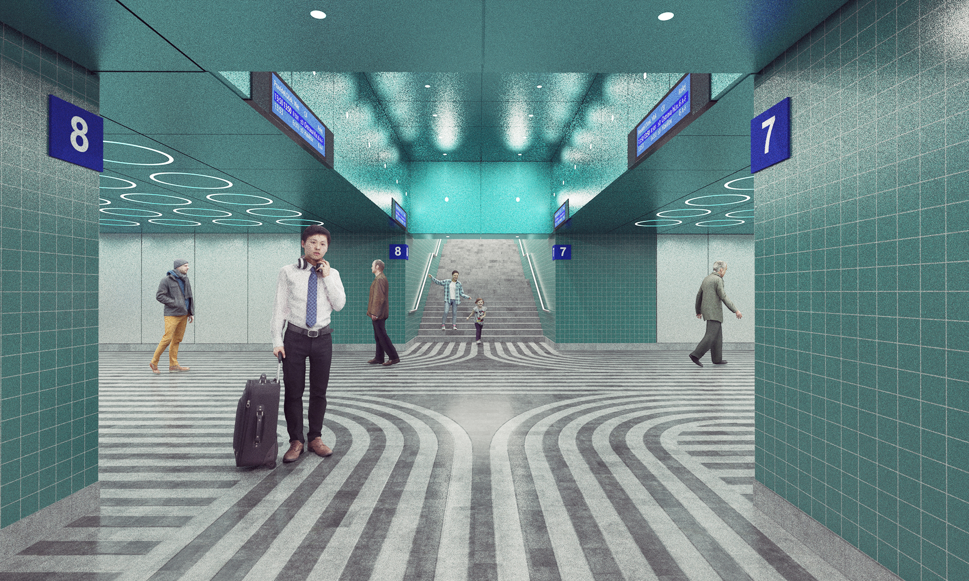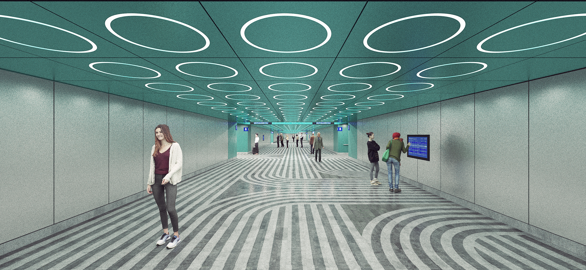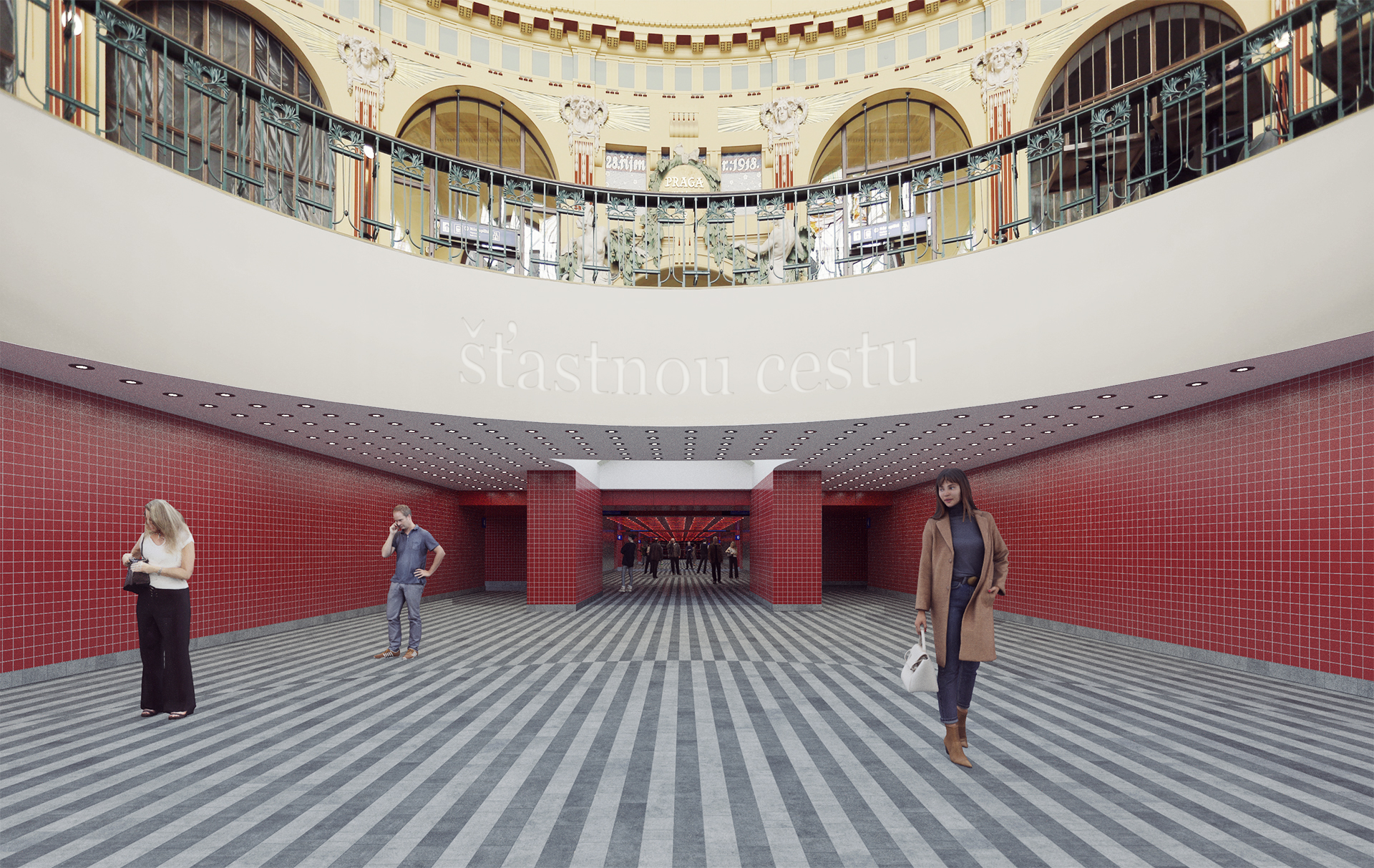 Náš soutěžní návrh pro Správu železnic si klade za cíl vytvoření výrazné a zapamatovatelné vizuální identity podchodů železniční stanice Praha – hlavní nádraží. Vyzdvihujeme kvality originálu a proto je hlavní inspirací architektonické řešení brutalistní odbavovací haly a historické secesní budovy. Sjednocený vzhled se odlišuje pouze výraznou barevností jednotlivých podchodů, která podporuje jednoduchou orientaci cestujících.