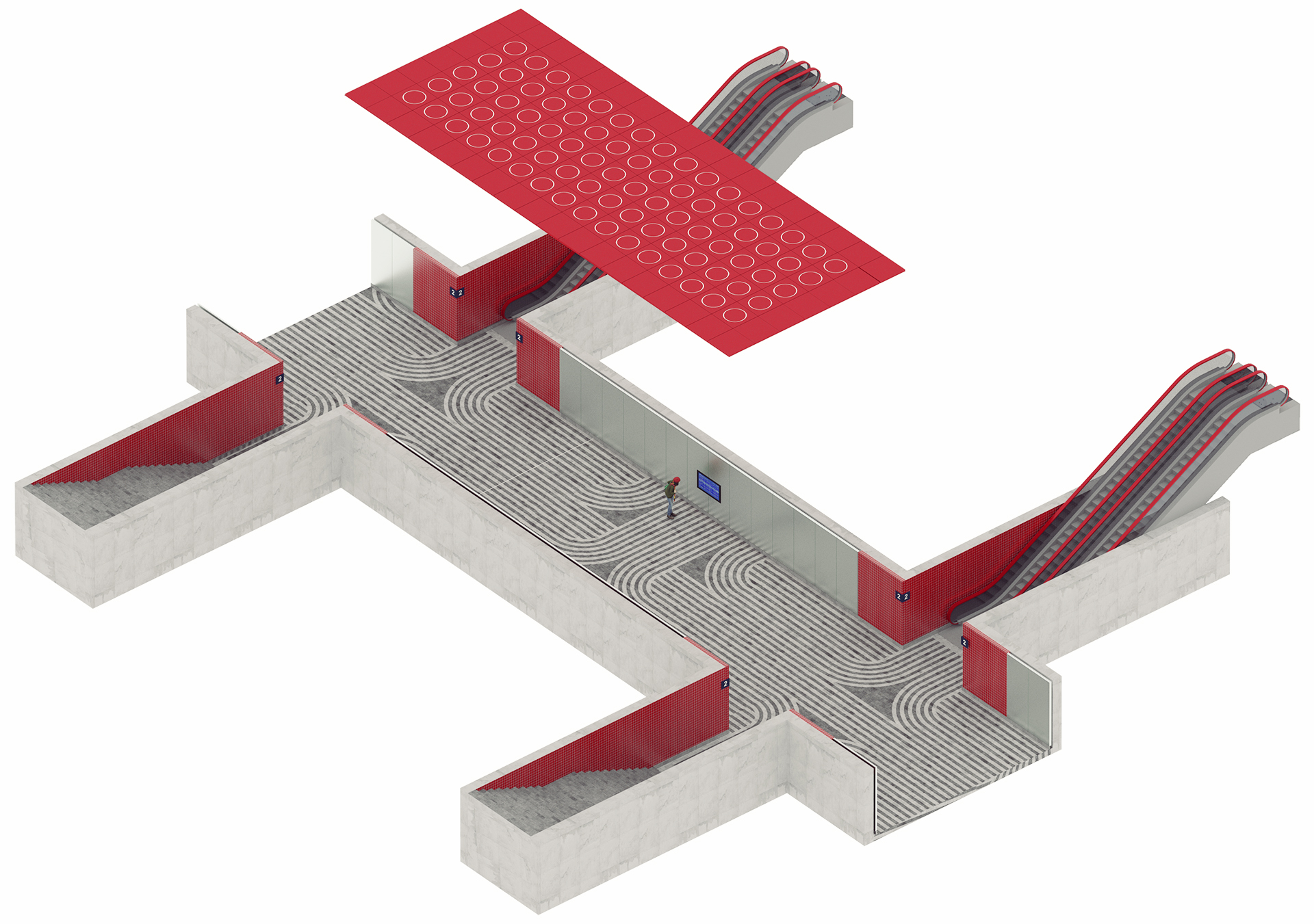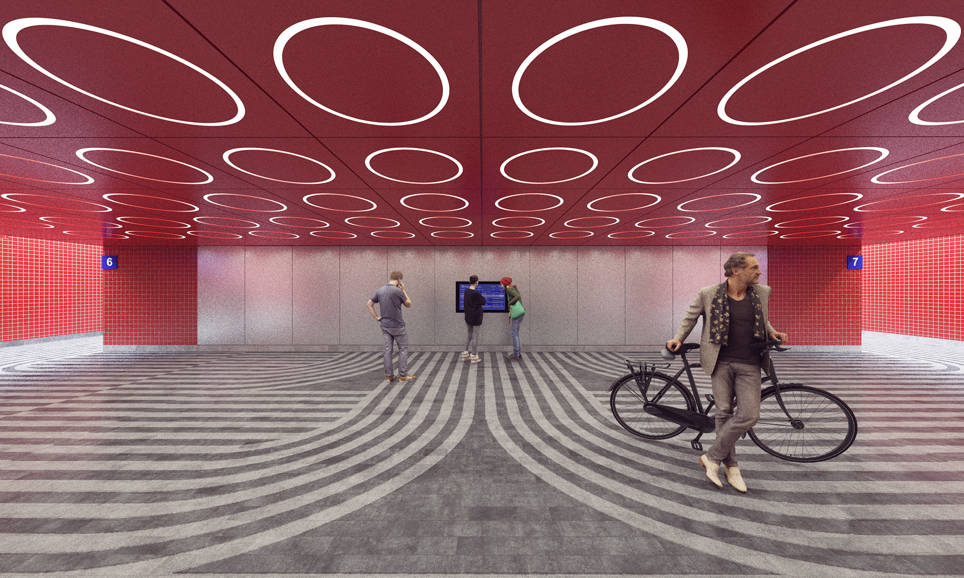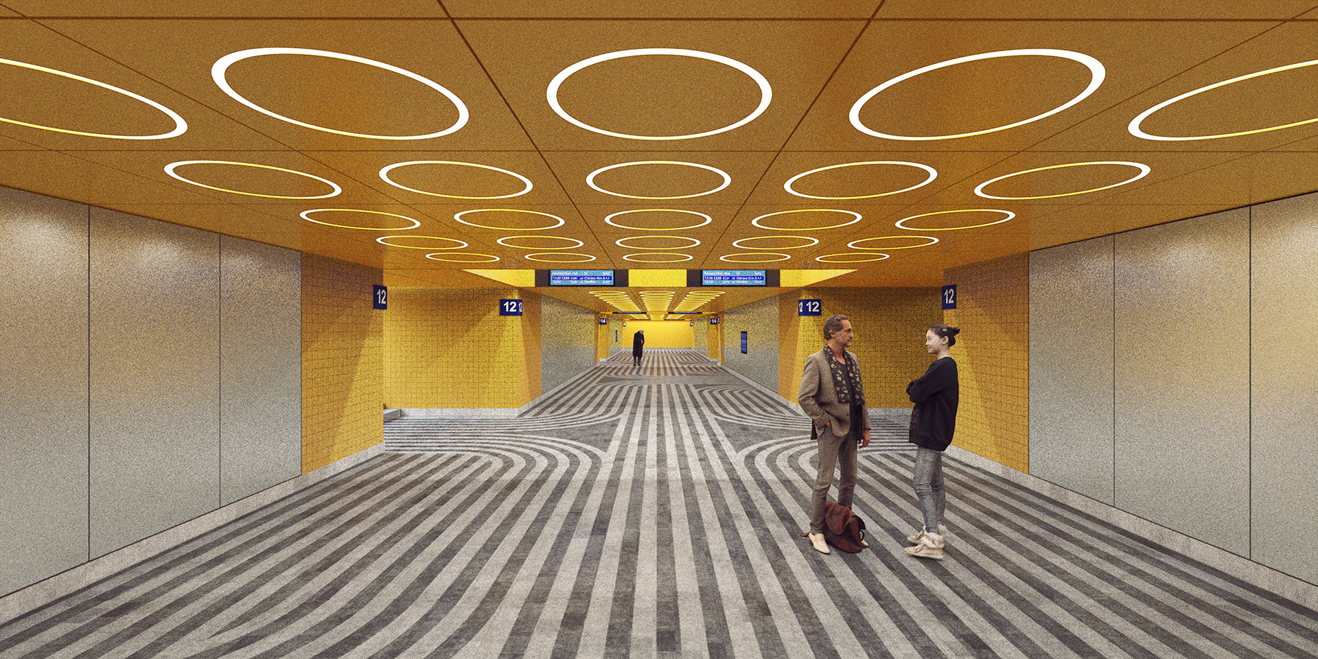 Náš soutěžní návrh pro Správu železnic si klade za cíl vytvoření výrazné a zapamatovatelné vizuální identity podchodů železniční stanice Praha – hlavní nádraží. Vyzdvihujeme kvality originálu a proto je hlavní inspirací architektonické řešení brutalistní odbavovací haly a historické secesní budovy. Sjednocený vzhled se odlišuje pouze výraznou barevností jednotlivých podchodů, která podporuje jednoduchou orientaci cestujících.