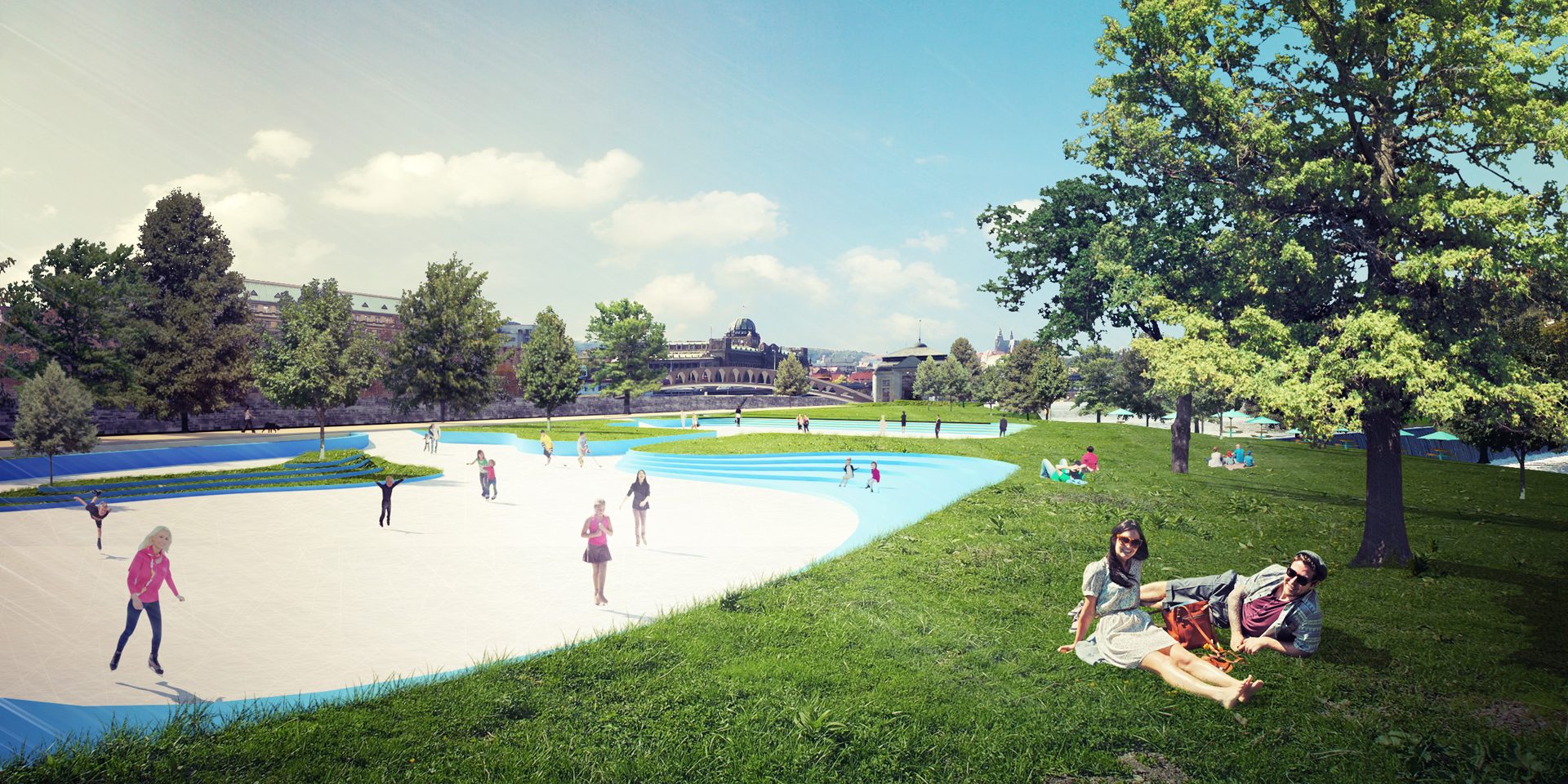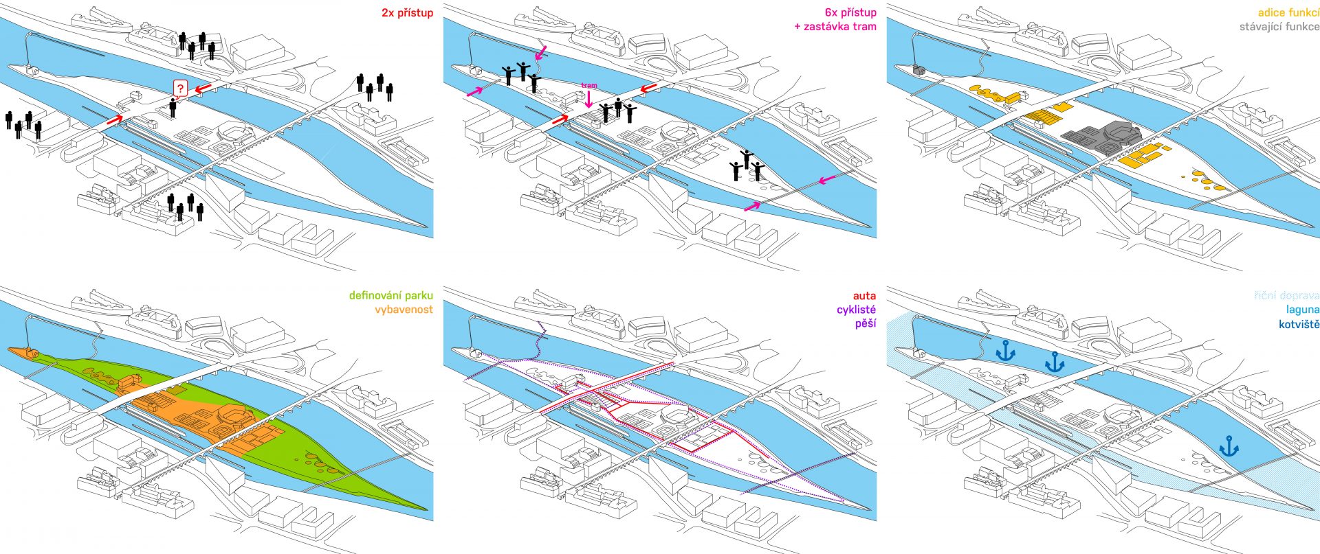 Vize budoucnosti Štvanice vychází z její minulosti. Ostrov si Pražané stále spojují s aktivitami, které z něj ale postupně vymizely. Jejich současným obnovením a doplněním se může navázat na jedinečnou historii ostrova novým životem. Nechme Štvanici znovu ožít jako celopražsky významné místo rekreace a setkávání lidí v městském parku u řeky. Aby si Pražané (a nejen oni) mohli užívat ostrova tak jako kdysi, musí se na něj ale nejdřív snadno dostat. Pěší a cyklo lávky doplní chybějící vazby okolních čtvrtí, nová tramvajová zastávka pomůže zpřístupnit ostrov pro celé širší centrum. Dostavěná Fuchsova kavárna vytvoří dominantu a vstupní bránu ostrova. Její zadní stěna se stane znovu tribunou k celoročnímu venkovnímu kluzišti – živému památníku českého hokeje a krasobruslení. Na bývalou plovárnu navážou lázně skryté v terénním zlomu. Oblouky Negrelliho viaduktu vyplní zázemí pro nová sportoviště, zbytek ostrova zabydlí místa k sezení, cesty, mola, stromy, ptáci, šumění řeky… … a lidé.