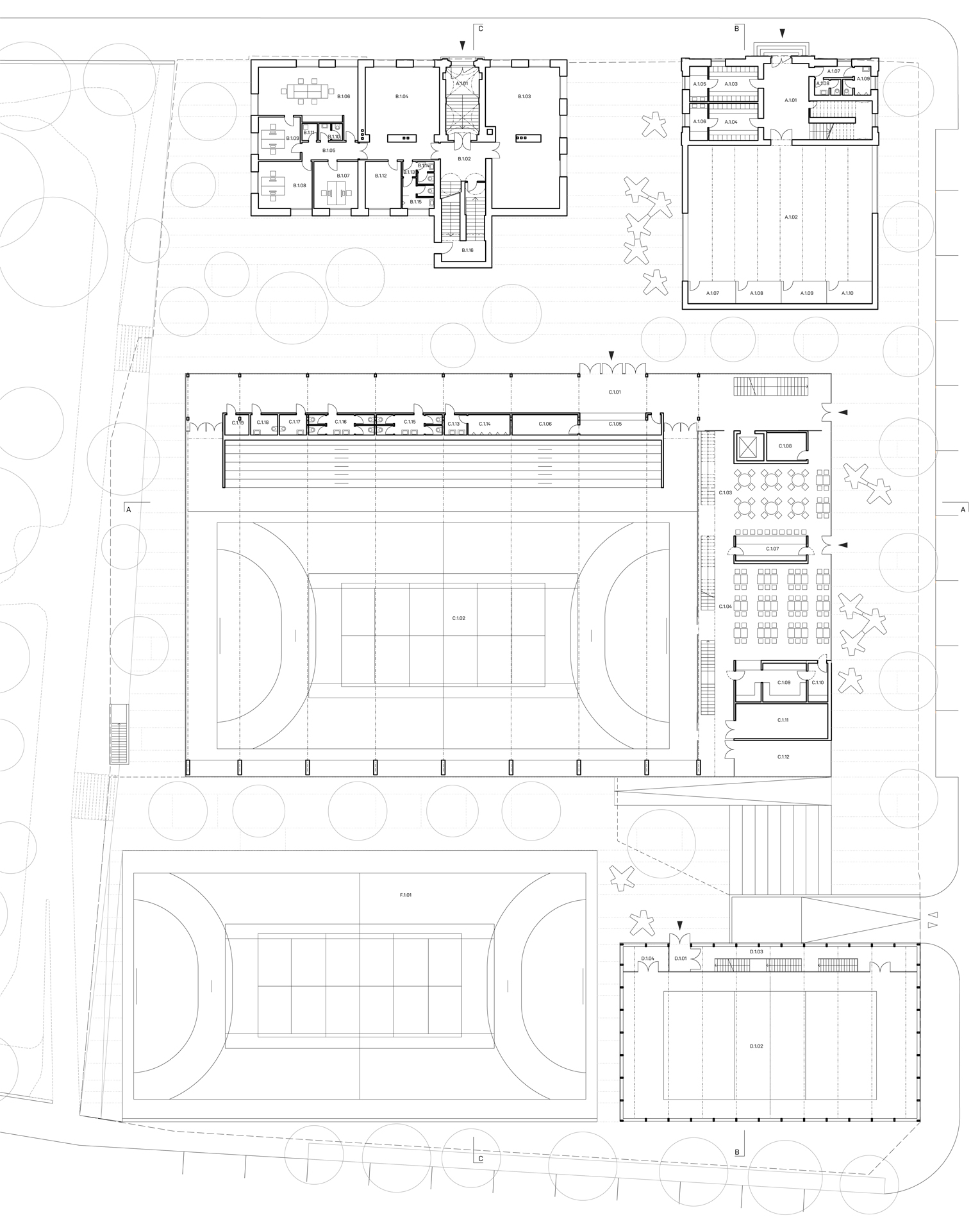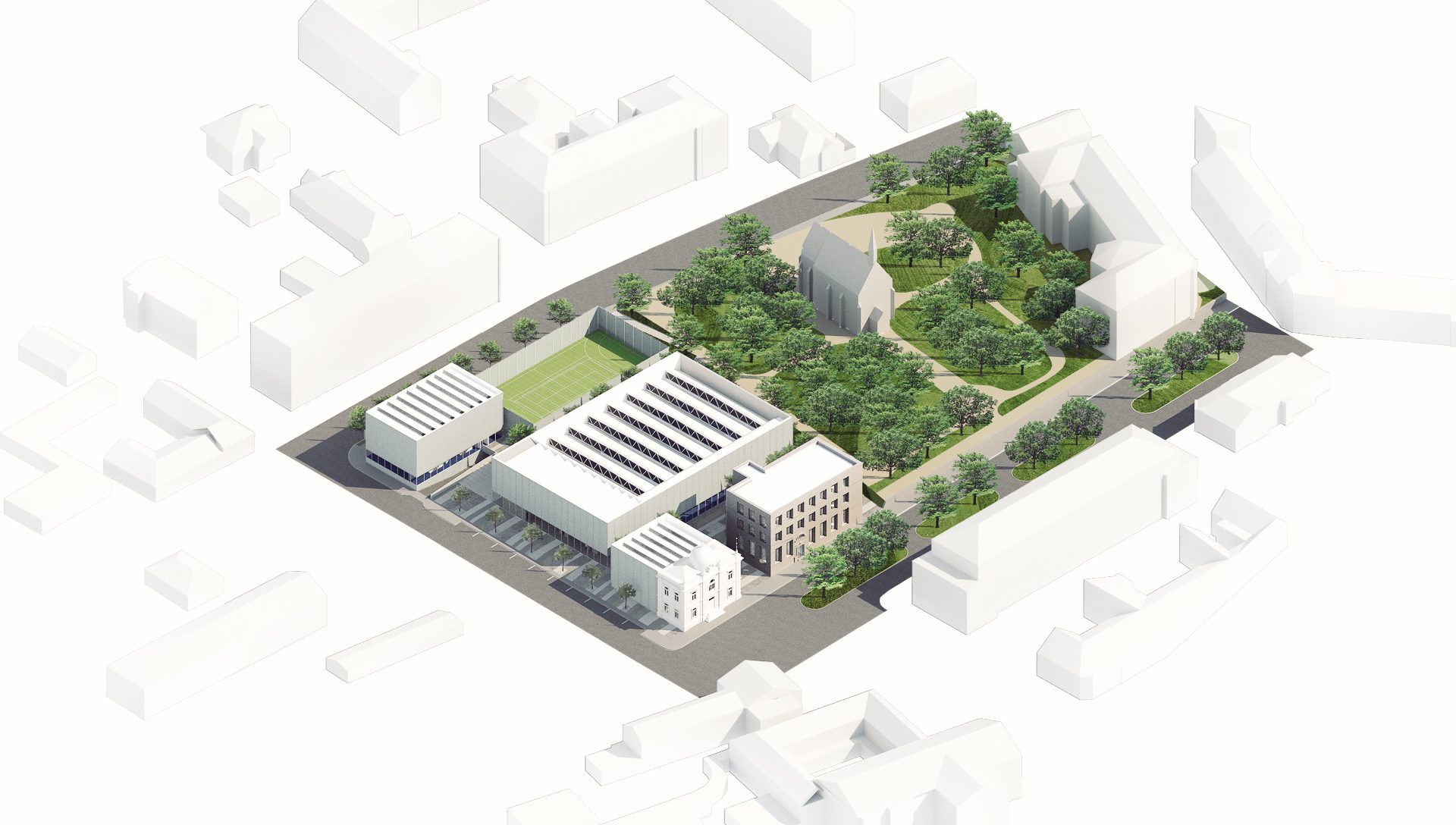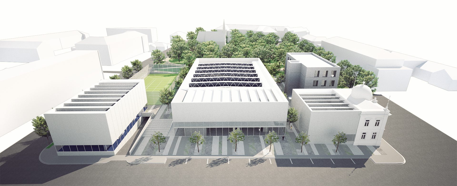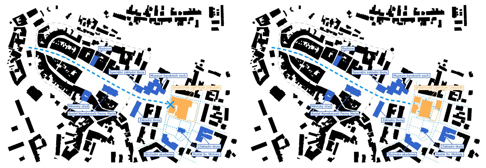 Sportovní areál Sokola v Chrudimi je situováno na významné ose staveb občanské vybavenosti, která plynule stoupá od Resselova náměstí a je ukončena výraznou hmotou objektu bývalé sokolovny a navazujícího Tyršova domu. Přestože má areál takto významnou polohu v kontextu města, působí v současnosti jako bariéra v území. Návrh si klade za cíl především zpřístupnění a napojení areálu na okolní veřejné stavby a prostory. Rozdělení požadovaného programu do jednotlivých samostatných objektů – pavilonů, vytváří porézní městskou strukturu, umožňující návštěvníkům přístup na malé piazzetty mezi jednotlivými objekty z několika klíčových míst navazujícího veřejného prostoru. Jako důležitá součást návrhu je propojení se sousedním Michalským parkem s dominantou kostela svatého Michala. Rozdělení stavebního programu do více samostatných objektů umožňuje navíc požadovanou etapizaci výstavby. Objekt sokolovny a to především jeho západní fasáda do Tyršova náměstí je výraznou dominantou při průhledech z náměstí. Tragédii tohoto původně krásného objektu jsme se rozhodli napravit obnovou části jeho fasády do původního stavu z roku 1892. Sokolovna by měla znovu být „landmarkem“ celého areálu. Skutečnost, že je areál obklopen hned několika školami, předpokládá intenzivní využívání piazzett a navazujícího Michalského parku rovnoměrně po celý den.