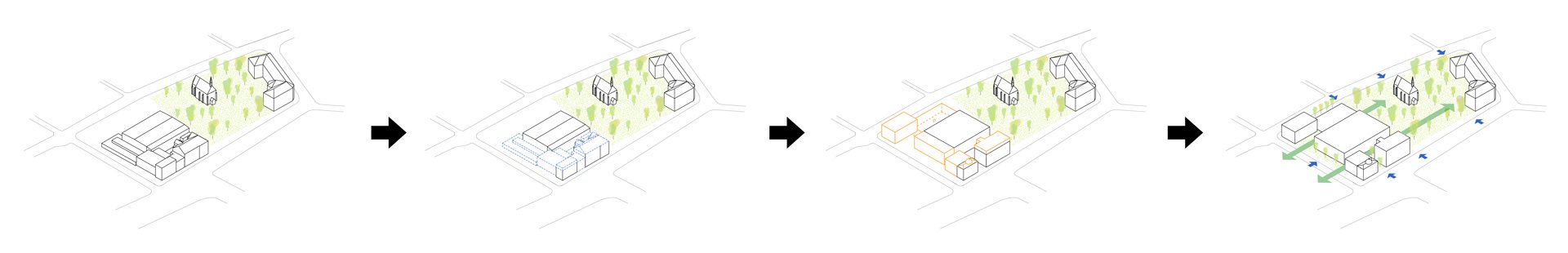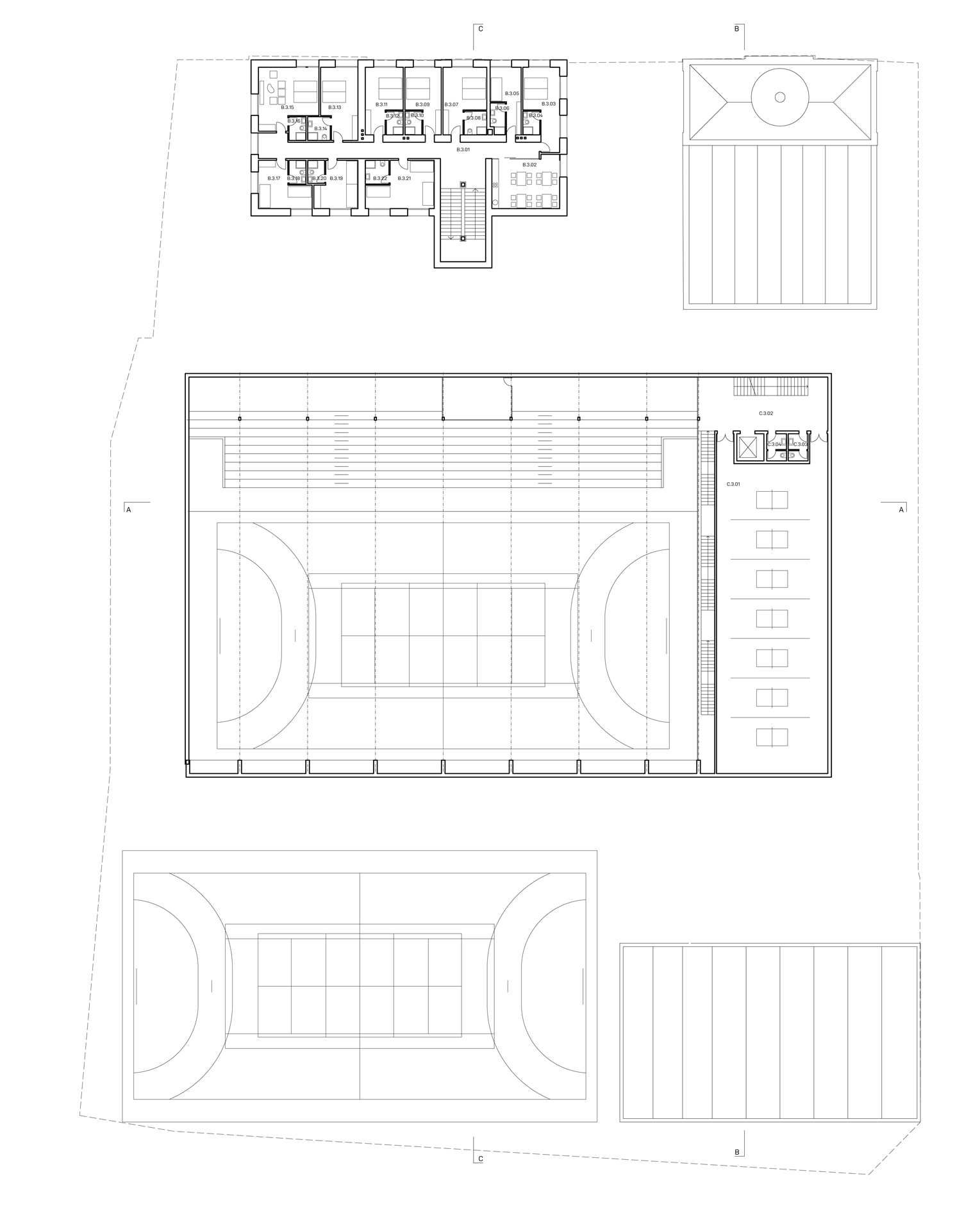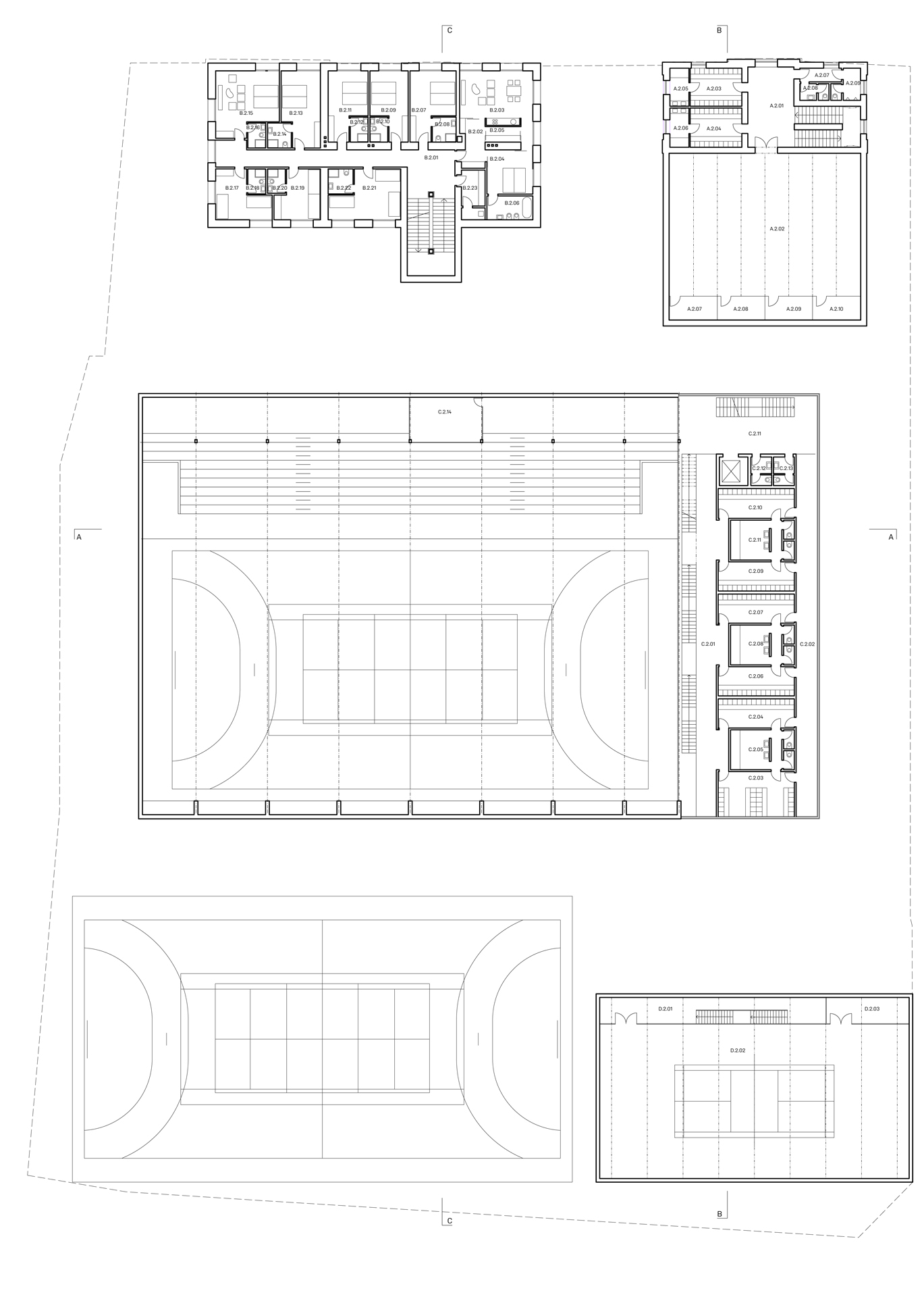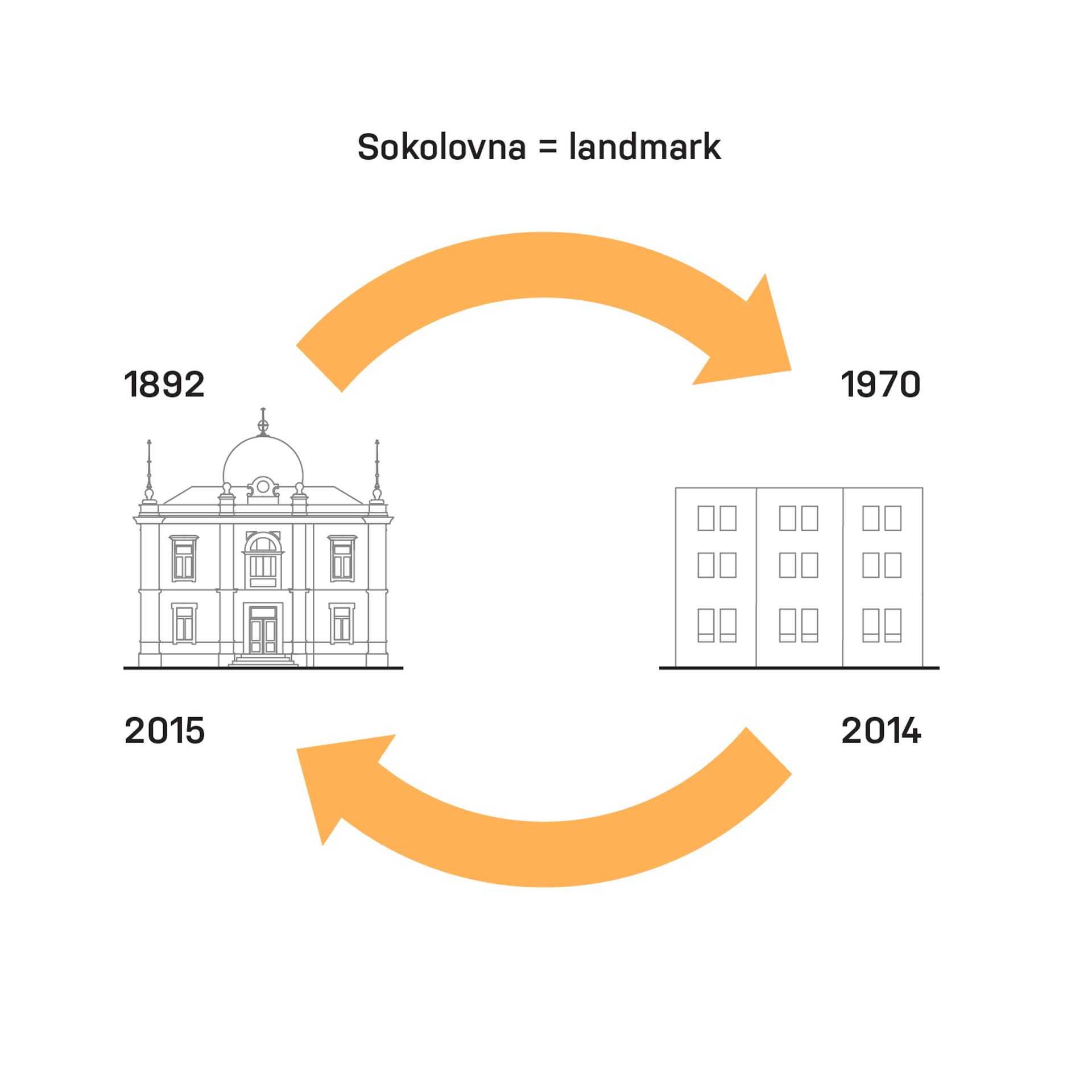 Sportovní areál Sokola v Chrudimi je situováno na významné ose staveb občanské vybavenosti, která plynule stoupá od Resselova náměstí a je ukončena výraznou hmotou objektu bývalé sokolovny a navazujícího Tyršova domu. Přestože má areál takto významnou polohu v kontextu města, působí v současnosti jako bariéra v území. Návrh si klade za cíl především zpřístupnění a napojení areálu na okolní veřejné stavby a prostory. Rozdělení požadovaného programu do jednotlivých samostatných objektů – pavilonů, vytváří porézní městskou strukturu, umožňující návštěvníkům přístup na malé piazzetty mezi jednotlivými objekty z několika klíčových míst navazujícího veřejného prostoru. Jako důležitá součást návrhu je propojení se sousedním Michalským parkem s dominantou kostela svatého Michala. Rozdělení stavebního programu do více samostatných objektů umožňuje navíc požadovanou etapizaci výstavby. Objekt sokolovny a to především jeho západní fasáda do Tyršova náměstí je výraznou dominantou při průhledech z náměstí. Tragédii tohoto původně krásného objektu jsme se rozhodli napravit obnovou části jeho fasády do původního stavu z roku 1892. Sokolovna by měla znovu být „landmarkem“ celého areálu. Skutečnost, že je areál obklopen hned několika školami, předpokládá intenzivní využívání piazzett a navazujícího Michalského parku rovnoměrně po celý den.