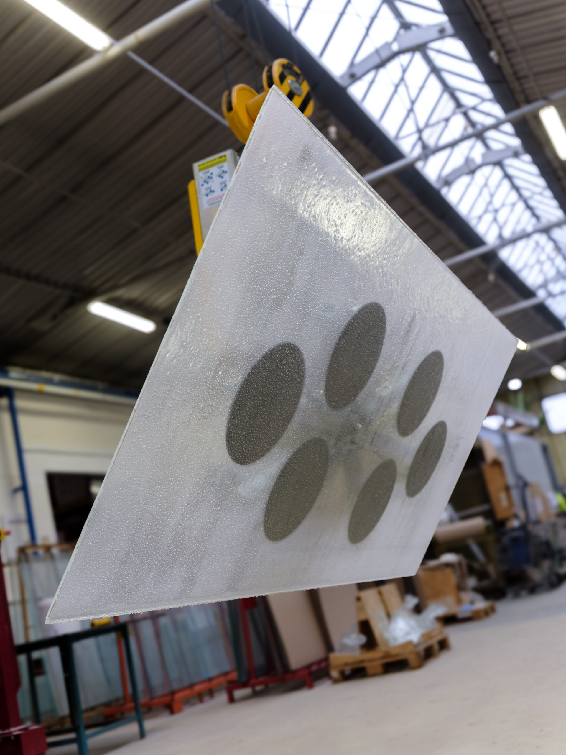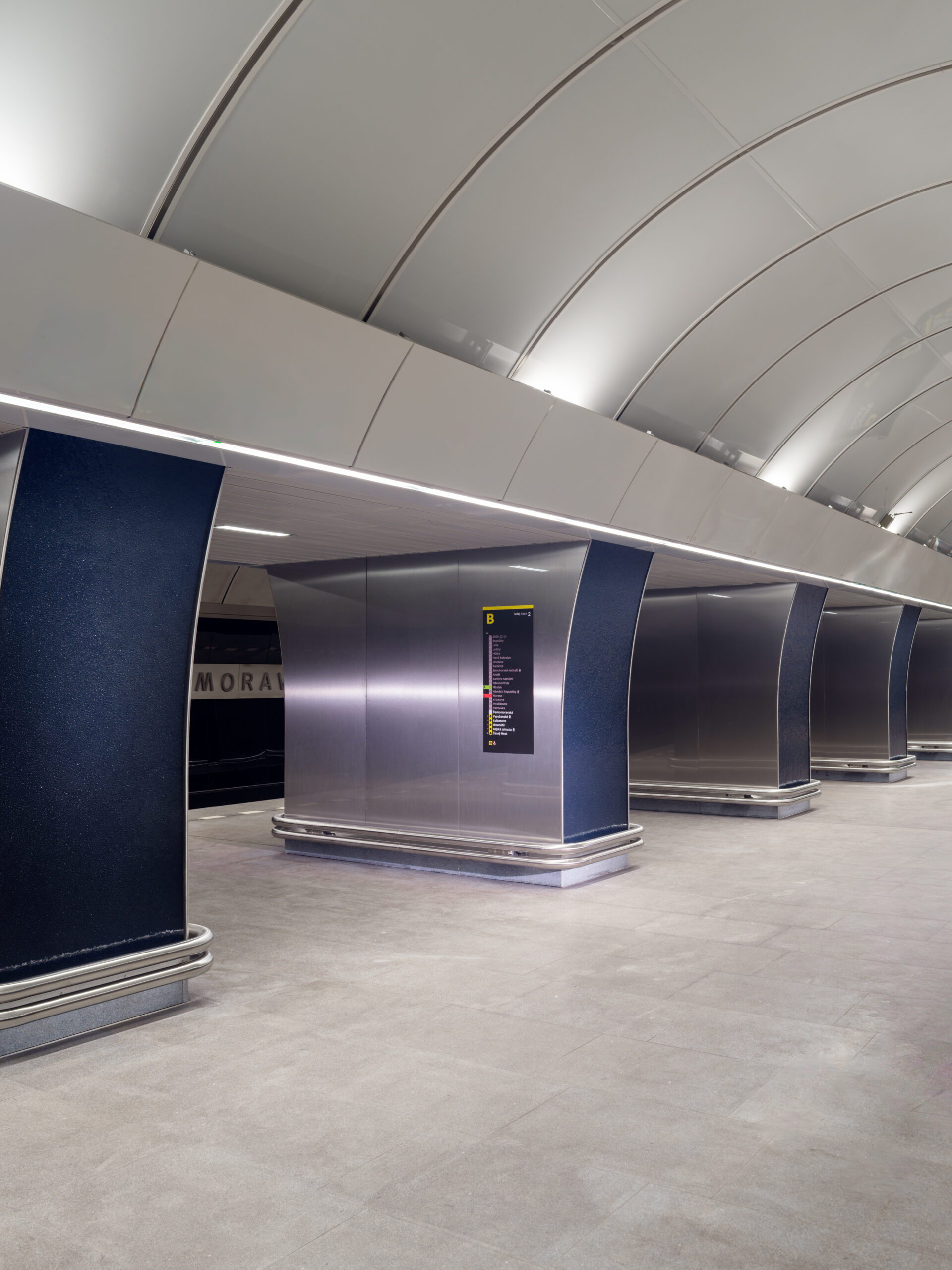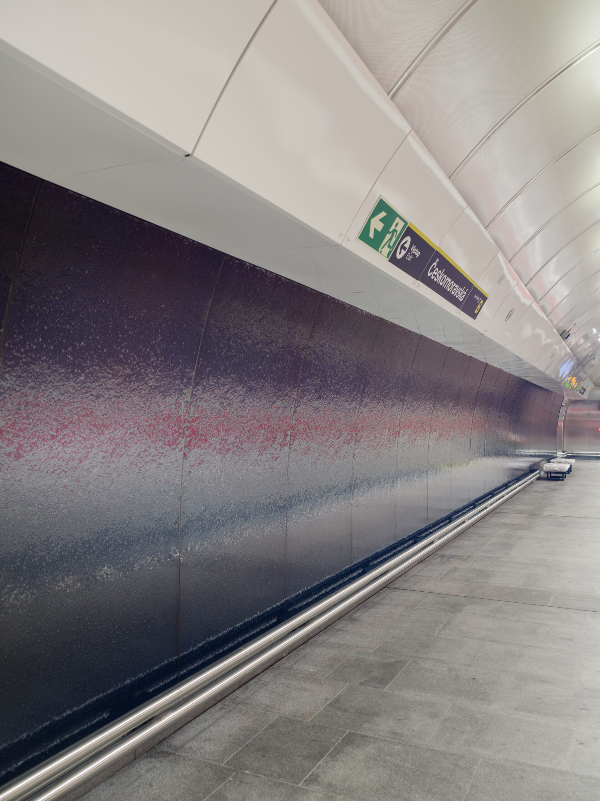 Bereme samotný ruch, stres, hemžení, cestování a pohyb jako svébytný a určující prvek a rozhodli jsme pro něj vytvořit univerzální prostředí, které tento ruch jemně odráží a reflektuje skrze skleněný rastr. Tento rastr vychází ze současného keramického obkladu a jeho struktury, zrnitosti, neutrálnosti. Mezi dvěma skly je zachycen vzduch, který proudí celým systémem metra a je neviditelnou a neoddělitelnou součástí podzemního systému cestování. Rastr je vytvořen spojením a v žáru stavením dvou skleněných ploch, mezi nimiž zůstávají zachyceny bublinky. Každé sklo vytváří unikátní rastr, který však lze jednoduše replikovat. Rastr skla lépe absorbuje potenciální optické poškození a poškrábání. Krytí čel pilířů řešíme zaoblením narozdíl od původního lomení. To nám umožňuje testovat několik variant obkladu a to skleněné dlaždice i celoplošné zasklení.
